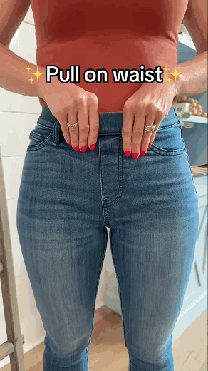 These jeans feature a slimming and figure flattering pull on fit! No zipper! No buttons! We are OBSESSED!! Just pull and go for easy styling and a clean and classic fit! The front pockets are faux for an extremely flattering silhouette!